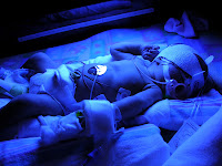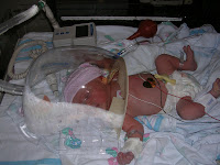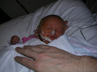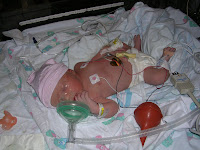 Emma getting oxygen through nasal prongs and being fed through a tube.