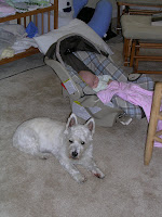 So Bailey has taken a very nurturing role with Emma. She has been torn between watching over mom or Emma and I often find her at night sleeping in the hall in between the bedrooms. When I took this picture I hadn't seen Bailey in a while and went looking for her; she was "guarding" Emma while Emma slept. Bailey will often find me when Emma is crying to make sure I know and has a couple times growled at me for not getting to Emma sooner. We have also seen her bring her toys (mainly her rope) to Emma when she is crying to (what we think is) calm her down. Annie, on the other hand, just wants to lick Emma to death which of course we don't let her do (for the benefit of all the moms that are reading this).